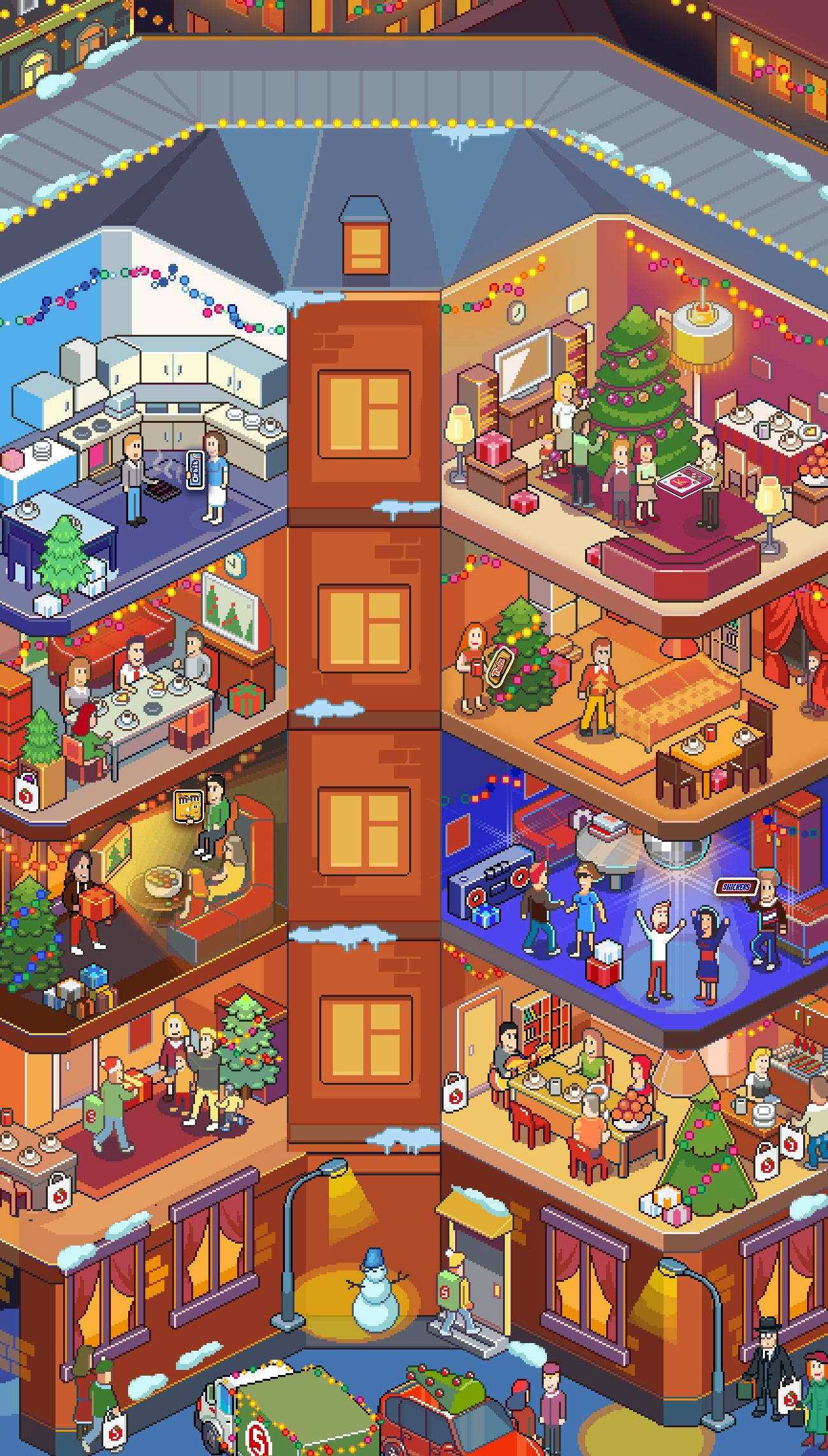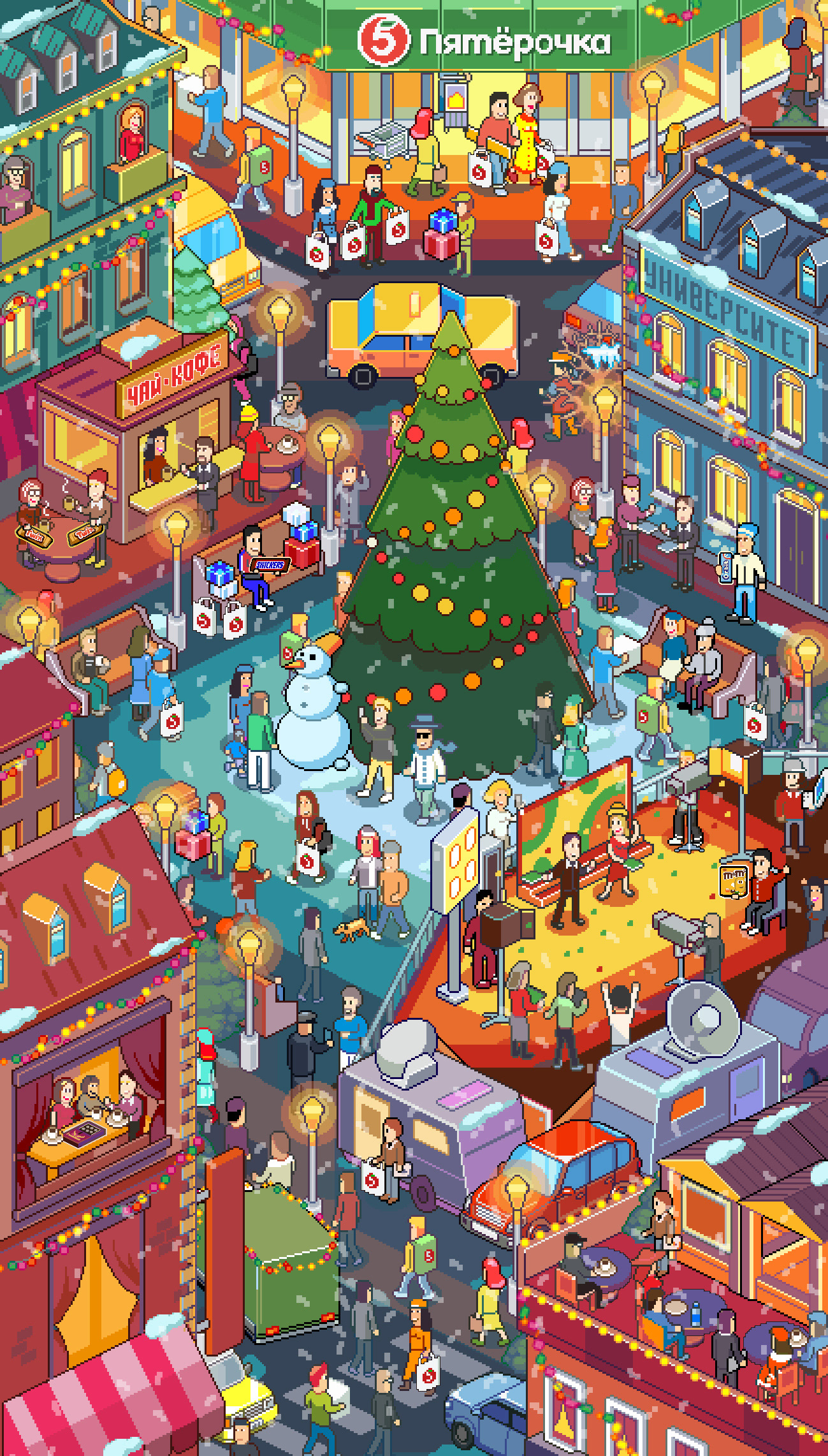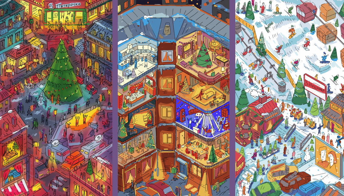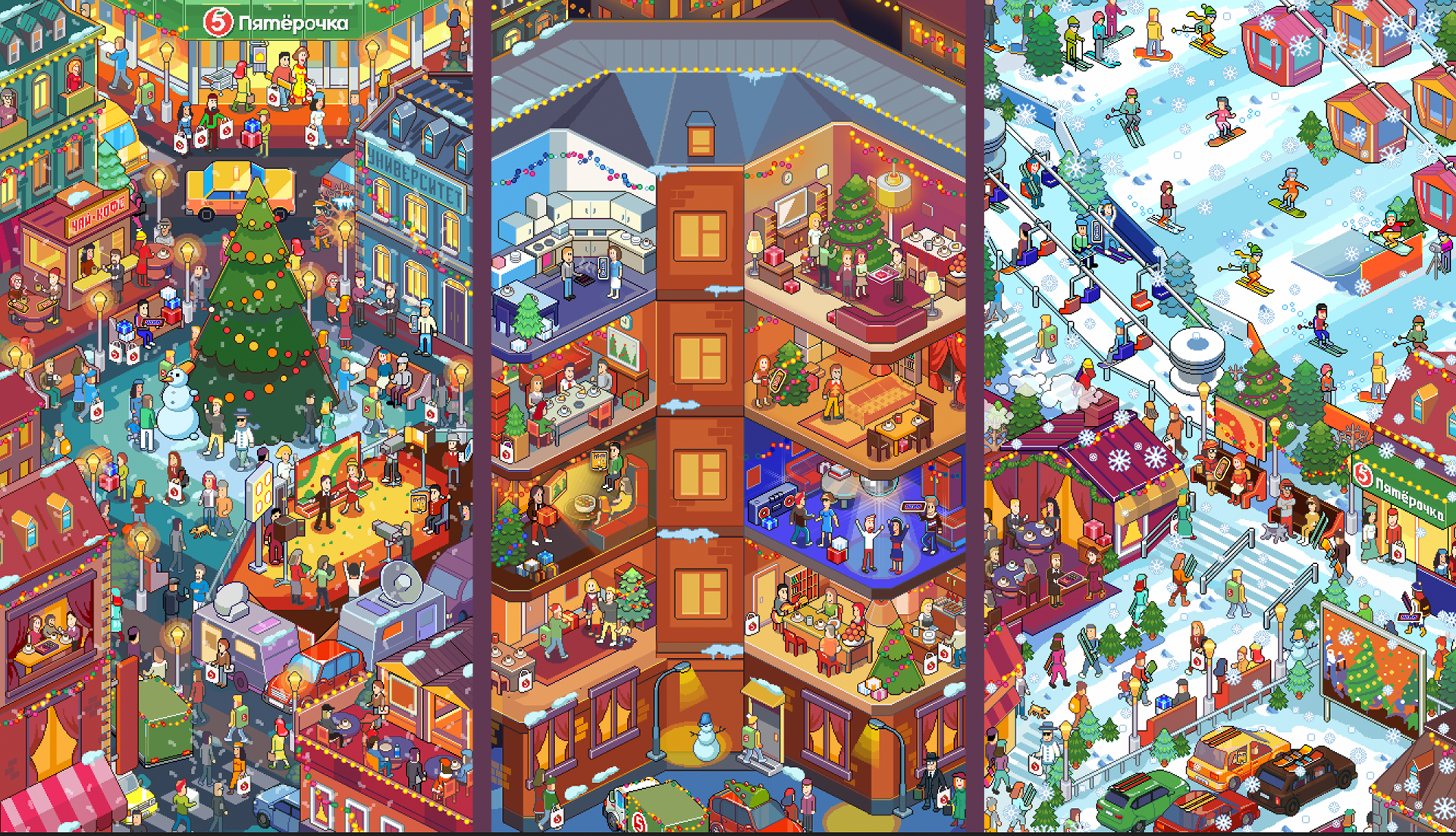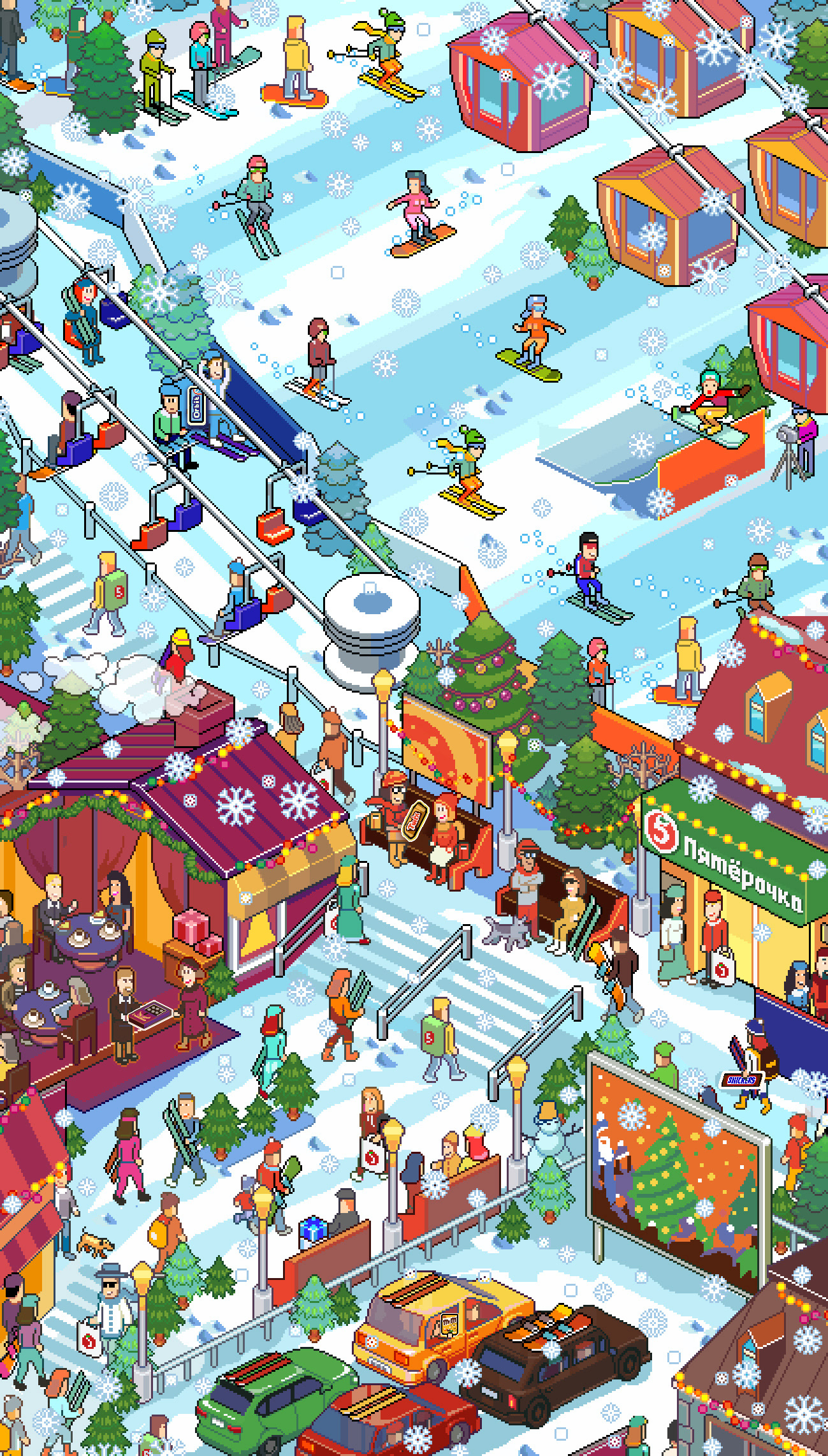 I was commissioned to do series of isometric pixelart illustrations, representing Xmas and usage of the client's products. There was necessary to show holidays celebration, winter activities, and other important elements and scenes.